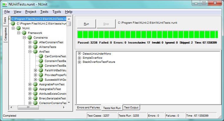 NUnit's own tests are available as an installation option. If you installed the tests, you may verify that the installation has worked successfully by running the NUnit gui and loading and running NUnitTests.nunit. All tests should pass.
