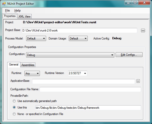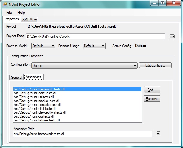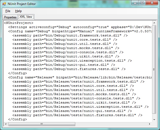 Beginning with NUnit 2.6, the Project Editor is a separate program, which may be executed directly or run through the Project | Edit dropdown menu of the NUnit GUI. The editor now provides two main views of the project: a property-oriented view based on the Project Editor that was built into earlier versions of the NUnit GUI and an xml view, which allows direct editing of the .nunit file.