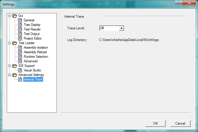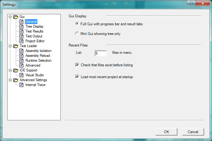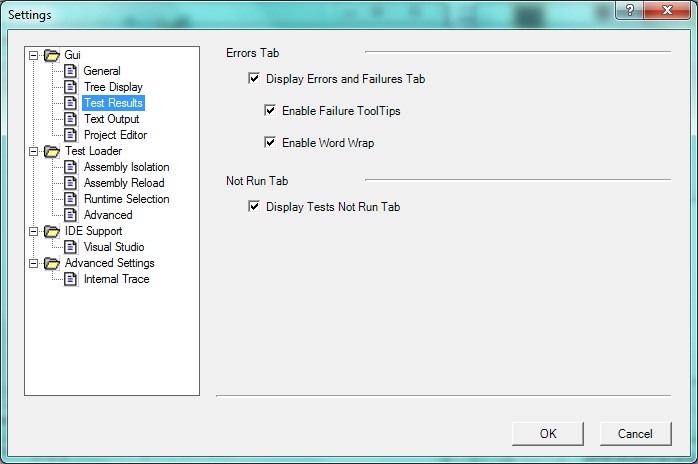 The Settings Dialog is displayed using the Tools | Settings menu item and allows the user to control some aspects of NUnit’s operation. Beginning with NUnit 2.4.4, a tree-based dialog replaced the older tabbed format.