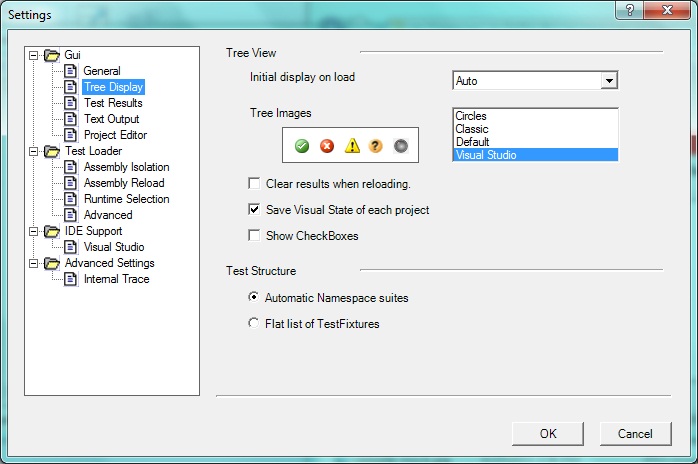NUnit provides four sets of Tree Images, which are used to mark tests in the gui as passing, failing, etc. Use the list box to select the preferred set. A preview of the selected set is displayed.