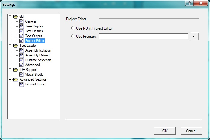 If you select Use NUnit Project Editor, the NUnit project editor is used.